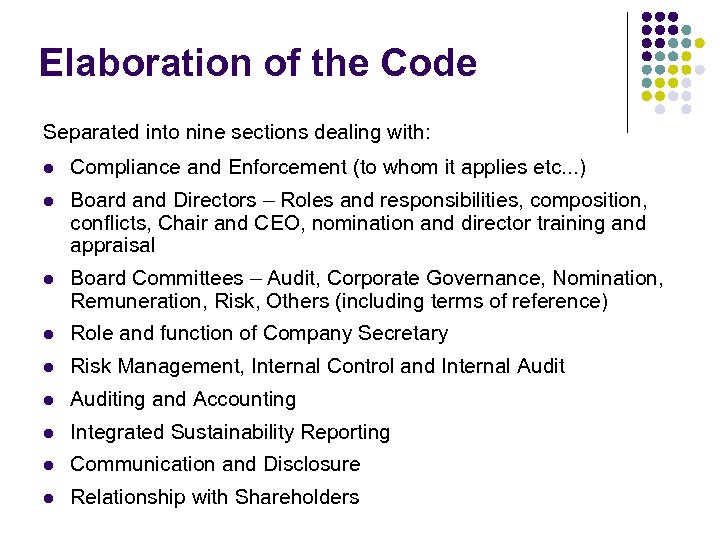 Elaboration of the Code Separated into nine sections dealing with: l Compliance and Enforcement (to whom it applies etc. . . ) l Board and Directors – Roles and responsibilities, composition, conflicts, Chair and CEO, nomination and director training and appraisal l Board Committees – Audit, Corporate Governance, Nomination, Remuneration, Risk, Others (including terms of reference) l Role and function of Company Secretary l Risk Management, Internal Control and Internal Auditing and Accounting l Integrated Sustainability Reporting l Communication and Disclosure l Relationship with Shareholders