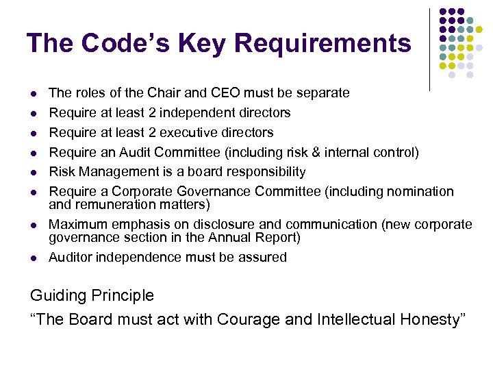 The Code’s Key Requirements l l l l The roles of the Chair and CEO must be separate Require at least 2 independent directors Require at least 2 executive directors Require an Audit Committee (including risk & internal control) Risk Management is a board responsibility Require a Corporate Governance Committee (including nomination and remuneration matters) Maximum emphasis on disclosure and communication (new corporate governance section in the Annual Report) Auditor independence must be assured Guiding Principle “The Board must act with Courage and Intellectual Honesty”