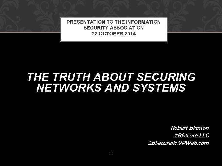 PRESENTATION TO THE INFORMATION SECURITY ASSOCIATION 22 OCTOBER 2014 THE TRUTH ABOUT SECURING NETWORKS AND SYSTEMS Robert Bigman 2 BSecure LLC 2 BSecurellc. VPWeb. com 1