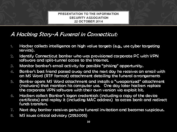 PRESENTATION TO THE INFORMATION SECURITY ASSOCIATION 22 OCTOBER 2014 A Hacking Story-A Funeral in Connecticut: 1. 2. 3. 4. 5. 6. 7. 8. Hacker collects intelligence on high value targets (e. g. , use cyber targeting service). Identify Connecticut banker who was provisioned corporate PC with VPN software and split-tunnel access to the Internet. Monitor banker’s email activity for possible “phising” opportunity. Banker’s best friend passed away and the next day he receives an email with an MS Word (RTF format) attachment detailing the funeral arrangements Banker opens MS Word attachment and installs a “weaponized” attachment (malware) that monitors his computer use. One day later hackers replace the corporate VPN software with their own version via exploit kit. Hackers collect Banker’s logon credentials (including a copy of the device certificate) and replay it (including MAC address) to access bank and redirect funds transfers. Next day banker receives genuine funeral invitation and becomes suspicious. MS issues critical advisory (2953095) 10