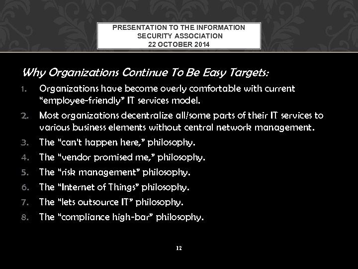 PRESENTATION TO THE INFORMATION SECURITY ASSOCIATION 22 OCTOBER 2014 Why Organizations Continue To Be Easy Targets: 1. 2. 3. 4. 5. 6. 7. 8. Organizations have become overly comfortable with current “employee-friendly” IT services model. Most organizations decentralize all/some parts of their IT services to various business elements without central network management. The “can’t happen here, ” philosophy. The “vendor promised me, ” philosophy. The “risk management” philosophy. The “Internet of Things” philosophy. The “lets outsource IT” philosophy. The “compliance high-bar” philosophy. 12