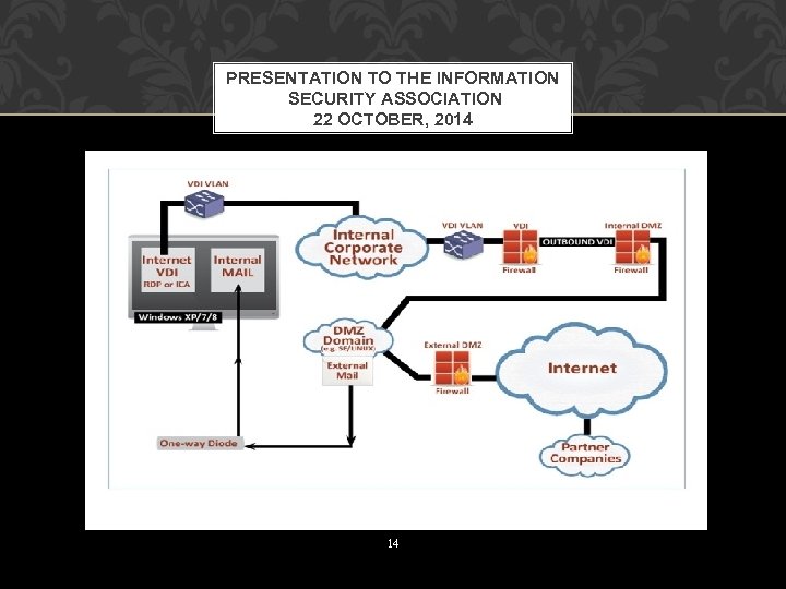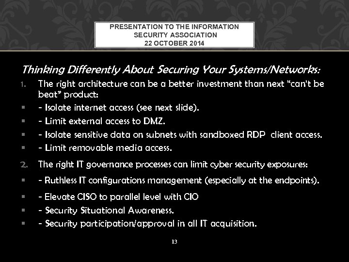 PRESENTATION TO THE INFORMATION SECURITY ASSOCIATION 22 OCTOBER 2014 Thinking Differently About Securing Your Systems/Networks: 1. § § The right architecture can be a better investment than next “can’t be beat” product: - Isolate internet access (see next slide). - Limit external access to DMZ. - Isolate sensitive data on subnets with sandboxed RDP client access. - Limit removable media access. 2. The right IT governance processes can limit cyber security exposures: § - Ruthless IT configurations management (especially at the endpoints). § § § - Elevate CISO to parallel level with CIO - Security Situational Awareness. - Security participation/approval in all IT acquisition. 13