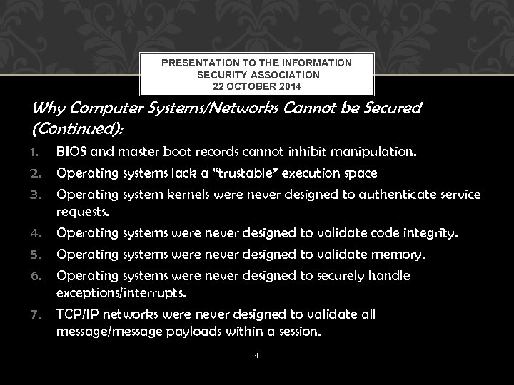 PRESENTATION TO THE INFORMATION SECURITY ASSOCIATION 22 OCTOBER 2014 Why Computer Systems/Networks Cannot be Secured (Continued): 1. 2. 3. 4. 5. 6. 7. BIOS and master boot records cannot inhibit manipulation. Operating systems lack a “trustable” execution space Operating system kernels were never designed to authenticate service requests. Operating systems were never designed to validate code integrity. Operating systems were never designed to validate memory. Operating systems were never designed to securely handle exceptions/interrupts. TCP/IP networks were never designed to validate all message/message payloads within a session. 4