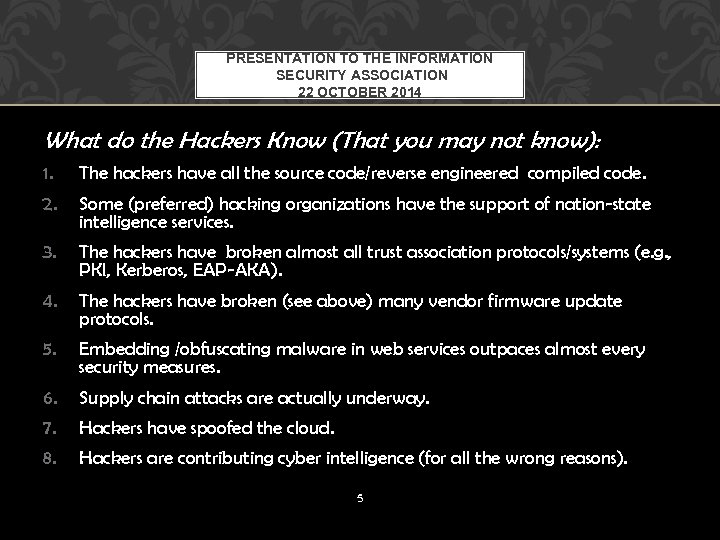 PRESENTATION TO THE INFORMATION SECURITY ASSOCIATION 22 OCTOBER 2014 What do the Hackers Know (That you may not know): 1. The hackers have all the source code/reverse engineered compiled code. 2. Some (preferred) hacking organizations have the support of nation-state intelligence services. 3. The hackers have broken almost all trust association protocols/systems (e. g. , PKI, Kerberos, EAP-AKA). 4. The hackers have broken (see above) many vendor firmware update protocols. 5. Embedding /obfuscating malware in web services outpaces almost every security measures. 6. Supply chain attacks are actually underway. 7. Hackers have spoofed the cloud. 8. Hackers are contributing cyber intelligence (for all the wrong reasons). 5