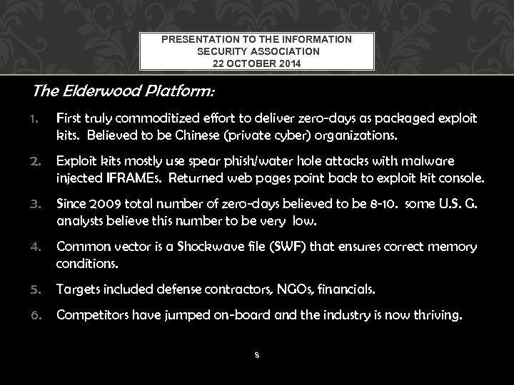 PRESENTATION TO THE INFORMATION SECURITY ASSOCIATION 22 OCTOBER 2014 The Elderwood Platform: 1. First truly commoditized effort to deliver zero-days as packaged exploit kits. Believed to be Chinese (private cyber) organizations. 2. Exploit kits mostly use spear phish/water hole attacks with malware injected IFRAMEs. Returned web pages point back to exploit kit console. 3. Since 2009 total number of zero-days believed to be 8 -10. some U. S. G. analysts believe this number to be very low. 4. Common vector is a Shockwave file (SWF) that ensures correct memory conditions. 5. Targets included defense contractors, NGOs, financials. 6. Competitors have jumped on-board and the industry is now thriving. 8