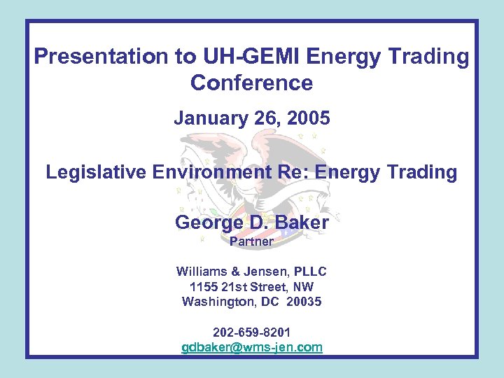 Presentation to UH-GEMI Energy Trading Conference January 26, 2005 Legislative Environment Re: Energy Trading George D. Baker Partner Williams & Jensen, PLLC 1155 21 st Street, NW Washington, DC 20035 202 -659 -8201 gdbaker@wms-jen. com