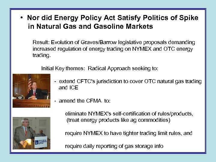 • Nor did Energy Policy Act Satisfy Politics of Spike in Natural Gas and Gasoline Markets Result: Evolution of Graves/Barrow legislative proposals demanding increased regulation of energy trading on NYMEX and OTC energy trading. Initial Key themes: Radical Approach seeking to: - extend CFTC's jurisdiction to cover OTC natural gas trading and ICE - amend the CFMA to: eliminate NYMEX's self-certification of rules/products, (treat energy products like ag commodities) require NYMEX to have tighter trading limit rules, and require daily reporting of gas storage info