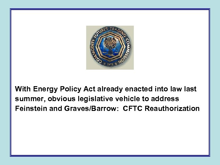 With Energy Policy Act already enacted into law last summer, obvious legislative vehicle to address Feinstein and Graves/Barrow: CFTC Reauthorization
