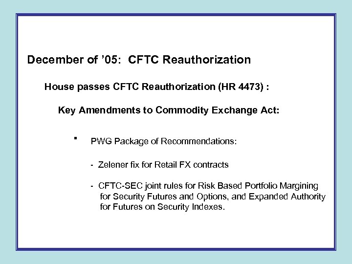 December of ’ 05: CFTC Reauthorization House passes CFTC Reauthorization (HR 4473) : Key Amendments to Commodity Exchange Act: ∙ PWG Package of Recommendations: - Zelener fix for Retail FX contracts - CFTC-SEC joint rules for Risk Based Portfolio Margining for Security Futures and Options, and Expanded Authority for Futures on Security Indexes.