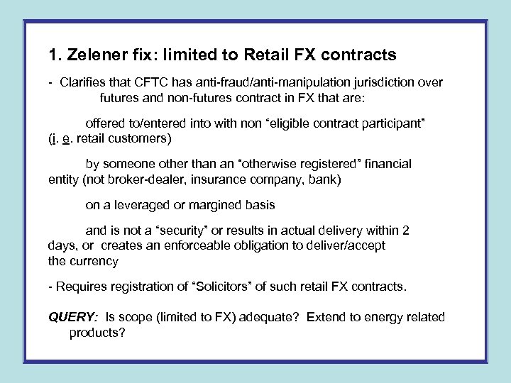1. Zelener fix: limited to Retail FX contracts - Clarifies that CFTC has anti-fraud/anti-manipulation jurisdiction over futures and non-futures contract in FX that are: offered to/entered into with non “eligible contract participant” (i. e. retail customers) by someone other than an “otherwise registered” financial entity (not broker-dealer, insurance company, bank) on a leveraged or margined basis and is not a “security” or results in actual delivery within 2 days, or creates an enforceable obligation to deliver/accept the currency - Requires registration of “Solicitors” of such retail FX contracts. QUERY: Is scope (limited to FX) adequate? Extend to energy related products?