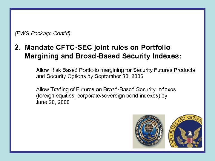 (PWG Package Cont’d) 2. Mandate CFTC-SEC joint rules on Portfolio Margining and Broad-Based Security Indexes: Allow Risk Based Portfolio margining for Security Futures Products and Security Options by September 30, 2006 Allow Trading of Futures on Broad-Based Security Indexes (foreign equities; corporate/sovereign bond indexes) by June 30, 2006