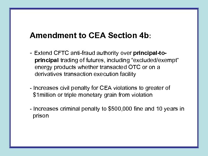 Amendment to CEA Section 4 b: - Extend CFTC anti-fraud authority over principal-toprincipal trading of futures, including “excluded/exempt” energy products whether transacted OTC or on a derivatives transaction execution facility - Increases civil penalty for CEA violations to greater of $1 million or triple monetary grain from violation - Increases criminal penalty to $500, 000 fine and 10 years in prison