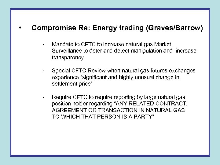 • Compromise Re: Energy trading (Graves/Barrow) - Mandate to CFTC to increase natural gas Market Surveillance to deter and detect manipulation and increase transparency - Special CFTC Review when natural gas futures exchanges experience “significant and highly unusual change in settlement price” - Require CFTC to require reporting by large natural gas position holder regarding “ANY RELATED CONTRACT, AGREEMENT OR TRANSACTION IN NATURAL GAS TO WHICH THAT PERSON IS A PARTY”