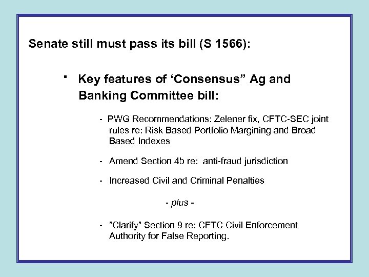 Senate still must pass its bill (S 1566): ∙ Key features of ‘Consensus” Ag and Banking Committee bill: - PWG Recommendations: Zelener fix, CFTC-SEC joint rules re: Risk Based Portfolio Margining and Broad Based Indexes - Amend Section 4 b re: anti-fraud jurisdiction - Increased Civil and Criminal Penalties - plus - ”Clarify” Section 9 re: CFTC Civil Enforcement Authority for False Reporting.
