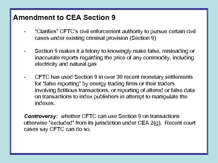 Amendment to CEA Section 9 - “Clarifies” CFTC’s civil enforcement authority to pursue certain civil cases under existing criminal provision (Section 9) - Section 9 makes it a felony to knowingly make false, misleading or inaccurate reports regarding the price of any commodity, including electricity and natural gas - CFTC has used Section 9 in over 30 recent monetary settlements for “false reporting” by energy trading firms or their traders involving fictitious transactions, or reporting of altered or false data on transactions to index publishers in attempt to manipulate the indexes. Controversy: whether CFTC can use Section 9 on transactions otherwise “excluded” from its jurisdiction under CEA 2(g). Recent court cases say CFTC can do so.