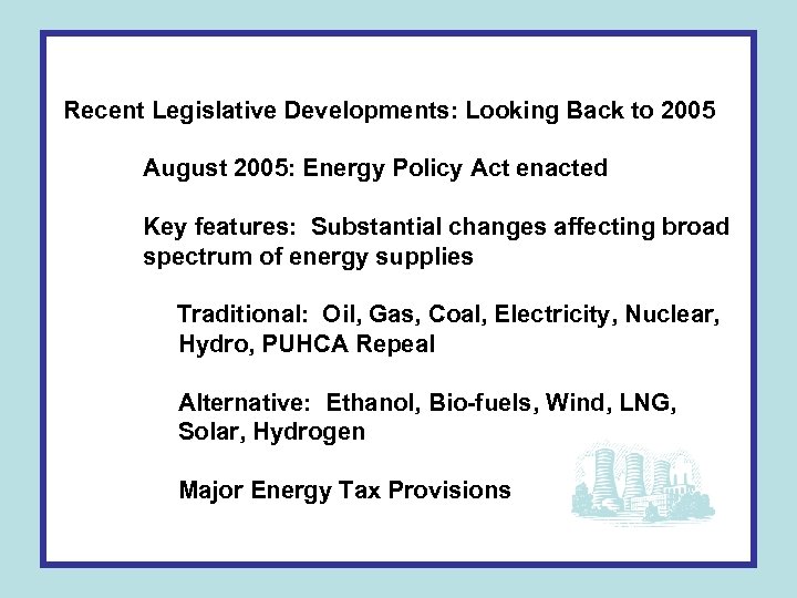 Recent Legislative Developments: Looking Back to 2005 August 2005: Energy Policy Act enacted Key features: Substantial changes affecting broad spectrum of energy supplies Traditional: Oil, Gas, Coal, Electricity, Nuclear, Hydro, PUHCA Repeal Alternative: Ethanol, Bio-fuels, Wind, LNG, Solar, Hydrogen Major Energy Tax Provisions