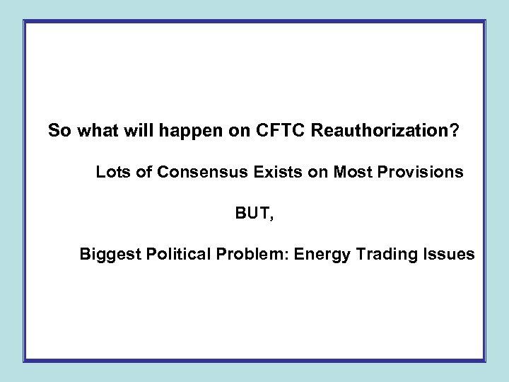 So what will happen on CFTC Reauthorization? Lots of Consensus Exists on Most Provisions BUT, Biggest Political Problem: Energy Trading Issues