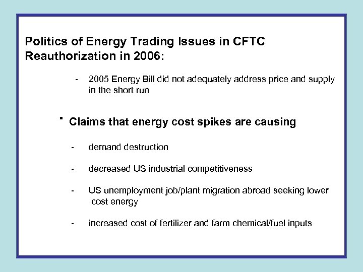 Politics of Energy Trading Issues in CFTC Reauthorization in 2006: - 2005 Energy Bill did not adequately address price and supply in the short run ∙ Claims that energy cost spikes are causing - demand destruction - decreased US industrial competitiveness - US unemployment job/plant migration abroad seeking lower cost energy - increased cost of fertilizer and farm chemical/fuel inputs