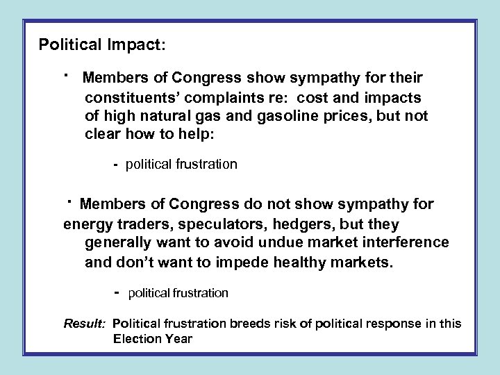 Political Impact: ∙ Members of Congress show sympathy for their constituents’ complaints re: cost and impacts of high natural gas and gasoline prices, but not clear how to help: - political frustration ∙ Members of Congress do not show sympathy for energy traders, speculators, hedgers, but they generally want to avoid undue market interference and don’t want to impede healthy markets. - political frustration Result: Political frustration breeds risk of political response in this Election Year