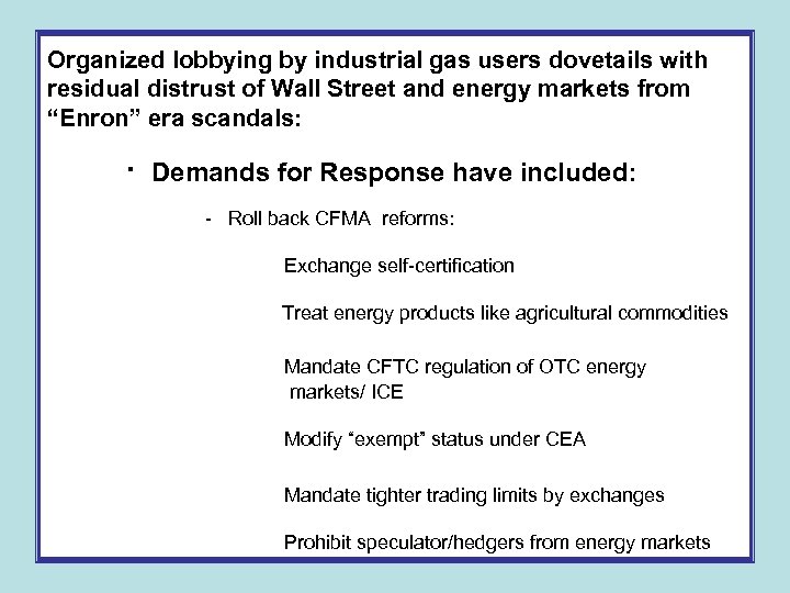 Organized lobbying by industrial gas users dovetails with residual distrust of Wall Street and energy markets from “Enron” era scandals: ∙ Demands for Response have included: - Roll back CFMA reforms: Exchange self-certification Treat energy products like agricultural commodities Mandate CFTC regulation of OTC energy markets/ ICE Modify “exempt” status under CEA Mandate tighter trading limits by exchanges Prohibit speculator/hedgers from energy markets