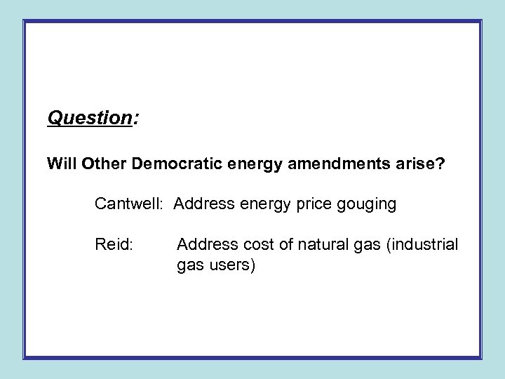 Question: Will Other Democratic energy amendments arise? Cantwell: Address energy price gouging Reid: Address cost of natural gas (industrial gas users)