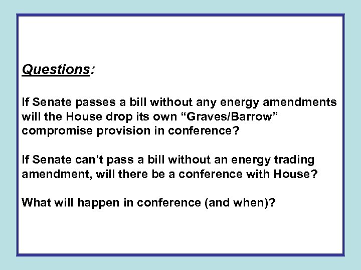 Questions: If Senate passes a bill without any energy amendments will the House drop its own “Graves/Barrow” compromise provision in conference? If Senate can’t pass a bill without an energy trading amendment, will there be a conference with House? What will happen in conference (and when)?