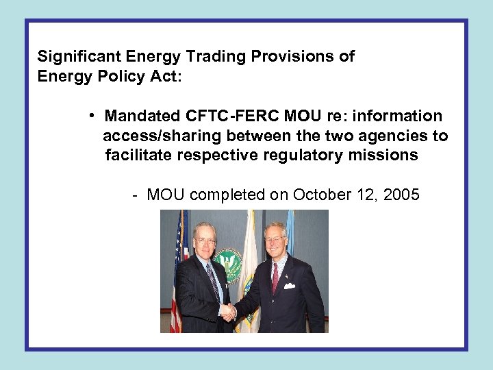 Significant Energy Trading Provisions of Energy Policy Act: • Mandated CFTC-FERC MOU re: information access/sharing between the two agencies to facilitate respective regulatory missions - MOU completed on October 12, 2005
