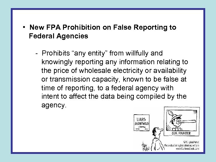 • New FPA Prohibition on False Reporting to Federal Agencies - Prohibits “any entity” from willfully and knowingly reporting any information relating to the price of wholesale electricity or availability or transmission capacity, known to be false at time of reporting, to a federal agency with intent to affect the data being compiled by the agency.