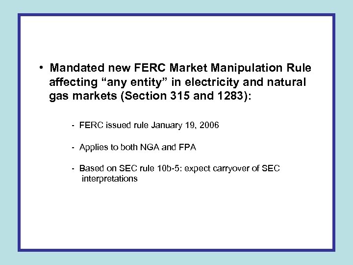 • Mandated new FERC Market Manipulation Rule affecting “any entity” in electricity and natural gas markets (Section 315 and 1283): - FERC issued rule January 19, 2006 - Applies to both NGA and FPA - Based on SEC rule 10 b-5: expect carryover of SEC interpretations