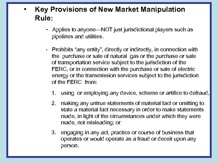 • Key Provisions of New Market Manipulation Rule: - Applies to anyone—NOT just jurisdictional players such as pipelines and utilities. - Prohibits “any entity”, directly or indirectly, in connection with the purchase or sale of natural gas or the purchase or sale of transportation service subject to the jurisdiction of the FERC, or in connection with the purchase or sale of electric energy or the transmission services subject to the jurisdiction of the FERC from: 1. using or employing any device, scheme or artifice to defraud, 2. making any untrue statements of material fact or omitting to state a material fact necessary in order to make statements made, in light of the circumstances under which they were made, not misleading; or 3. engaging in any act, practice or course of business that operates or would operate as a fraud or deceit upon any person.