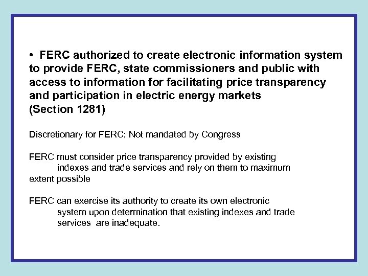 • FERC authorized to create electronic information system to provide FERC, state commissioners and public with access to information for facilitating price transparency and participation in electric energy markets (Section 1281) Discretionary for FERC; Not mandated by Congress FERC must consider price transparency provided by existing indexes and trade services and rely on them to maximum extent possible FERC can exercise its authority to create its own electronic system upon determination that existing indexes and trade services are inadequate.
