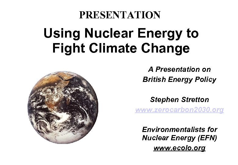 PRESENTATION Using Nuclear Energy to Fight Climate Change A Presentation on British Energy Policy Stephen Stretton www. zerocarbon 2030. org Environmentalists for Nuclear Energy (EFN) www. ecolo. org