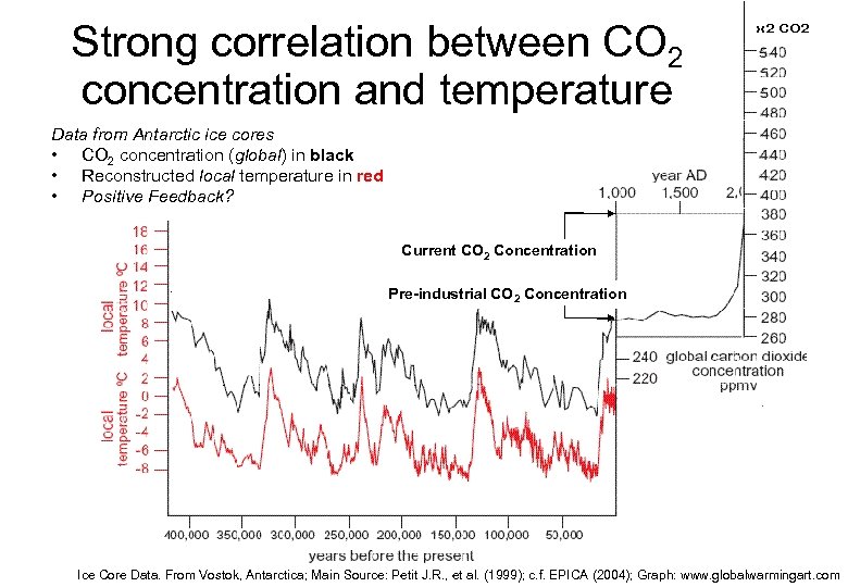 Strong correlation between CO 2 concentration and temperature Data from Antarctic ice cores • CO 2 concentration (global) in black • Reconstructed local temperature in red • Positive Feedback? Current CO 2 Concentration Pre-industrial CO 2 Concentration Ice Core Data. From Vostok, Antarctica; Main Source: Petit J. R. , et al. (1999); c. f. EPICA (2004); Graph: www. globalwarmingart. com