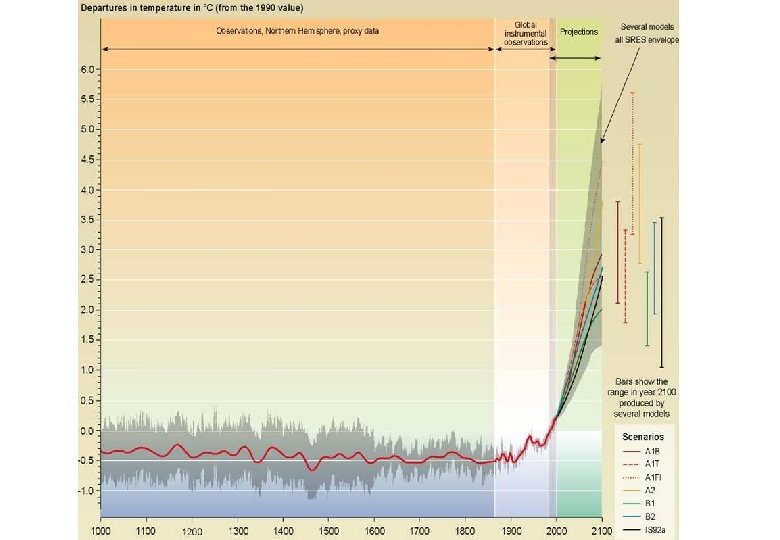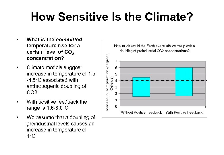How Sensitive Is the Climate? • What is the committed temperature rise for a certain level of CO 2 concentration? • Climate models suggest increase in temperature of 1. 5 -4. 5°C associated with anthropogenic doubling of CO 2 • With positive feedback the range is 1. 6 -6. 0°C • We assume that a doubling of preindustrial levels causes an increase in temperature of 4°C