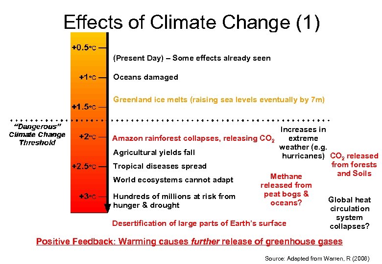 Effects of Climate Change (1) (Present Day) – Some effects already seen Oceans damaged Greenland ice melts (raising sea levels eventually by 7 m) Increases in extreme Amazon rainforest collapses, releasing CO 2 weather (e. g. Agricultural yields fall hurricanes) CO 2 released from forests Tropical diseases spread and Soils Methane World ecosystems cannot adapt released from peat bogs & Hundreds of millions at risk from Global heat oceans? hunger & drought circulation Desertification of large parts of Earth’s surface system collapses? Positive Feedback: Warming causes further release of greenhouse gases Source: Adapted from Warren, R (2006)