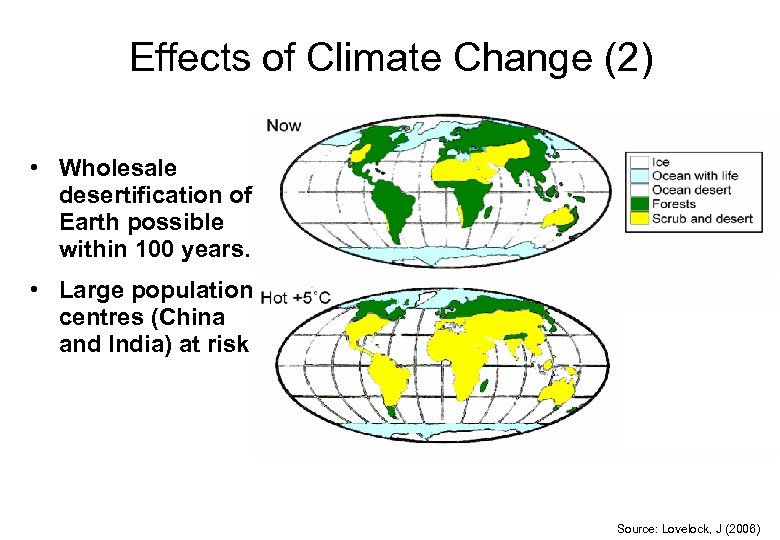 Effects of Climate Change (2) • Wholesale desertification of Earth possible within 100 years. • Large population centres (China and India) at risk Source: Lovelock, J (2006)