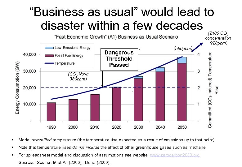 “Business as usual” would lead to disaster within a few decades (2100 CO 2 concentration 920 ppm) Dangerous Threshold Passed (550 ppm) (CO 2 Now: 380 ppm) • Model committed temperature (the temperature rise expected as a result of emissions up to that point). • Note that temperature rises do not include the effect of other greenhouse gases such as methane. • For spreadsheet model and discussion of assumptions see website: www. zerocarbon 2030. org. Sources: Sceffer, M et Al. (2006), Defra (2006).
