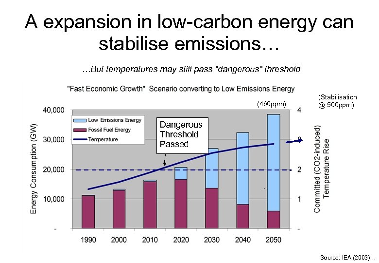 A expansion in low-carbon energy can stabilise emissions… …But temperatures may still pass “dangerous” threshold (460 ppm) (Stabilisation @ 500 ppm) Dangerous Threshold Passed Source: IEA (2003)…
