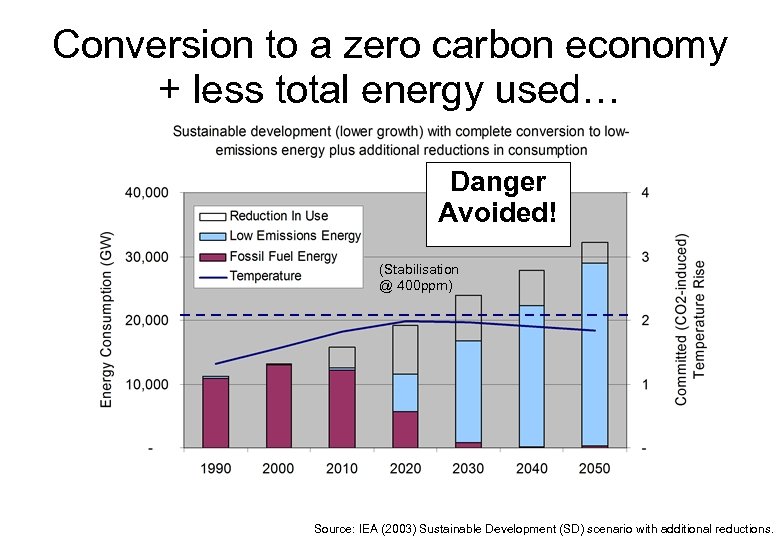 Conversion to a zero carbon economy + less total energy used… Danger Avoided! (Stabilisation @ 400 ppm) Source: IEA (2003) Sustainable Development (SD) scenario with additional reductions.