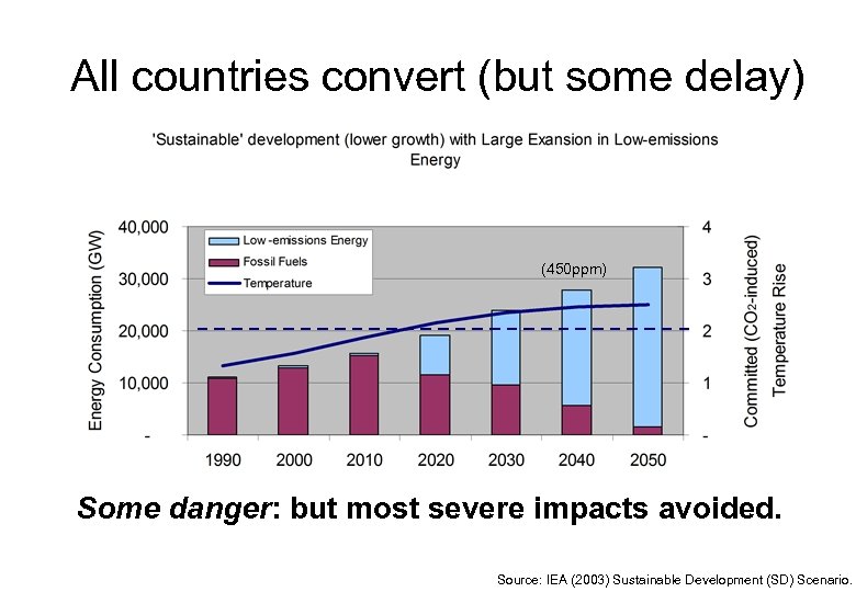 All countries convert (but some delay) (450 ppm) Some danger: but most severe impacts avoided. Source: IEA (2003) Sustainable Development (SD) Scenario.