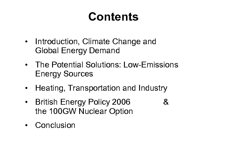 Contents • Introduction, Climate Change and Global Energy Demand • The Potential Solutions: Low-Emissions Energy Sources • Heating, Transportation and Industry • British Energy Policy 2006 the 100 GW Nuclear Option • Conclusion &
