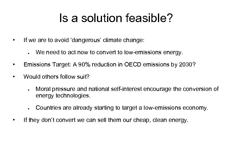 Is a solution feasible? • If we are to avoid ‘dangerous’ climate change: ● We need to act now to convert to low-emissions energy. • Emissions Target: A 90% reduction in OECD emissions by 2030? • Would others follow suit? ● ● • Moral pressure and national self-interest encourage the conversion of energy technologies. Countries are already starting to target a low-emissions economy. If they don’t convert we can sell them our cheap, clean energy.
