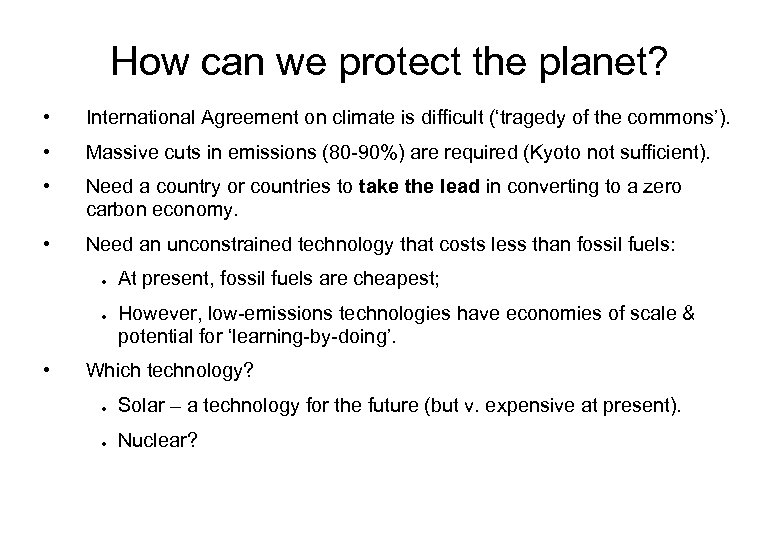 How can we protect the planet? • International Agreement on climate is difficult (‘tragedy of the commons’). • Massive cuts in emissions (80 -90%) are required (Kyoto not sufficient). • Need a country or countries to take the lead in converting to a zero carbon economy. • Need an unconstrained technology that costs less than fossil fuels: ● ● • At present, fossil fuels are cheapest; However, low-emissions technologies have economies of scale & potential for ‘learning-by-doing’. Which technology? ● Solar – a technology for the future (but v. expensive at present). ● Nuclear?