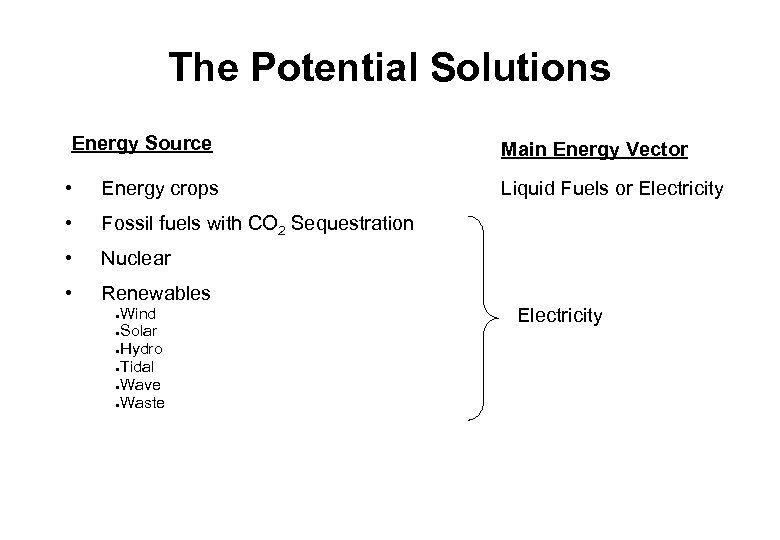 The Potential Solutions Energy Source • Energy crops • Fossil fuels with CO 2 Sequestration • Nuclear • Renewables Main Energy Vector Wind ●Solar ●Hydro ●Tidal ●Wave ●Waste ● Liquid Fuels or Electricity