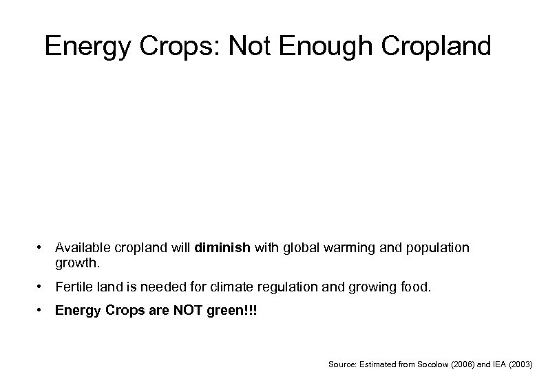 Energy Crops: Not Enough Cropland • Available cropland will diminish with global warming and population growth. • Fertile land is needed for climate regulation and growing food. • Energy Crops are NOT green!!! Source: Estimated from Socolow (2006) and IEA (2003)