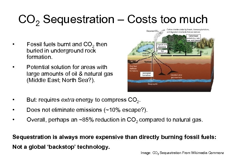 CO 2 Sequestration – Costs too much • Fossil fuels burnt and CO 2 then buried in underground rock formation. • Potential solution for areas with large amounts of oil & natural gas (Middle East; North Sea? ). • But: requires extra energy to compress CO 2. • Does not eliminate emissions (~10% escape? ). • Overall, perhaps an ~85% reduction in CO 2 compared to natural gas. Sequestration is always more expensive than directly burning fossil fuels: Not a global ‘backstop’ technology. Image: CO 2 Sequestration From Wikimedia Commons