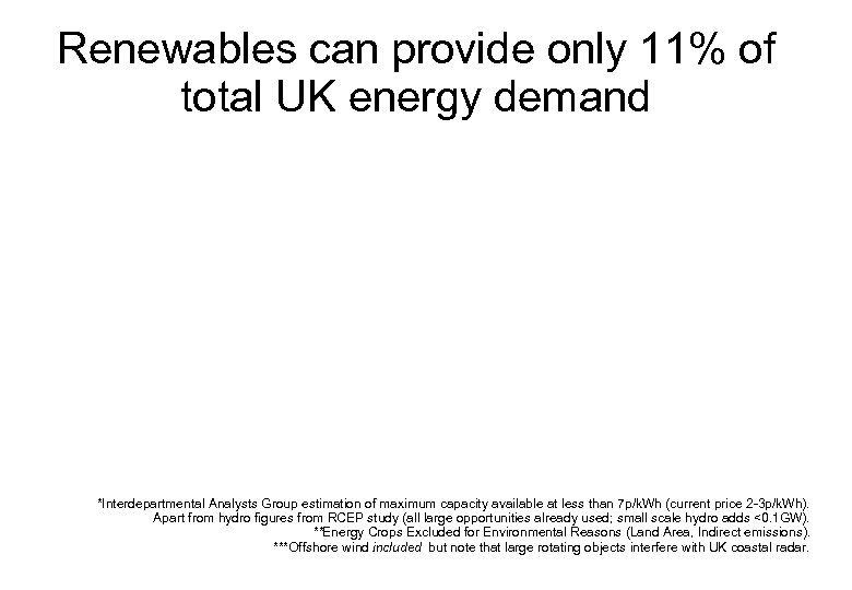 Renewables can provide only 11% of total UK energy demand *Interdepartmental Analysts Group estimation of maximum capacity available at less than 7 p/k. Wh (current price 2 -3 p/k. Wh). Apart from hydro figures from RCEP study (all large opportunities already used; small scale hydro adds <0. 1 GW). **Energy Crops Excluded for Environmental Reasons (Land Area, Indirect emissions). ***Offshore wind included but note that large rotating objects interfere with UK coastal radar.