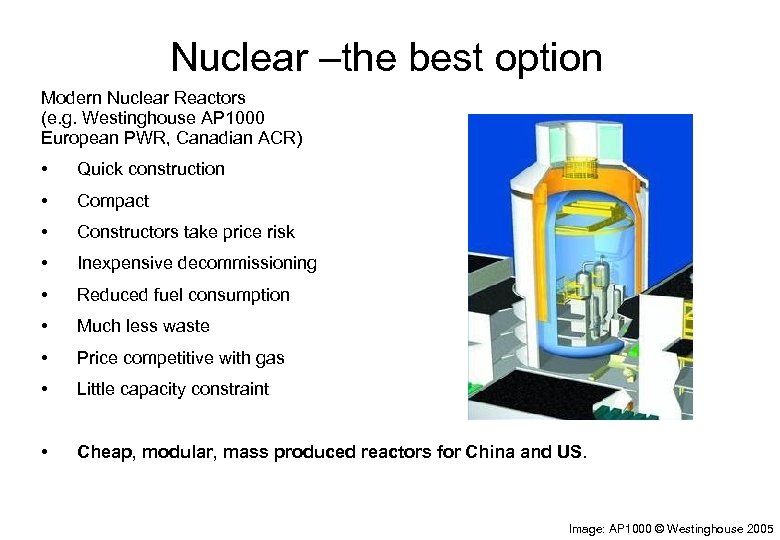 Nuclear –the best option Modern Nuclear Reactors (e. g. Westinghouse AP 1000 European PWR, Canadian ACR) • Quick construction • Compact • Constructors take price risk • Inexpensive decommissioning • Reduced fuel consumption • Much less waste • Price competitive with gas • Little capacity constraint • Cheap, modular, mass produced reactors for China and US. Image: AP 1000 © Westinghouse 2005