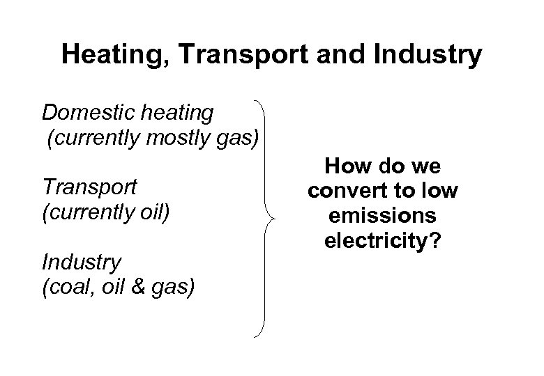 Heating, Transport and Industry Domestic heating (currently mostly gas) Transport (currently oil) Industry (coal, oil & gas) How do we convert to low emissions electricity?