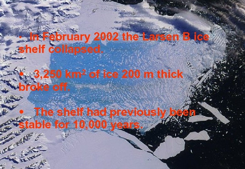 • In February 2002 the Larsen B ice shelf collapsed. • 3, 250 km 2 of ice 200 m thick broke off. • The shelf had previously been stable for 10, 000 years.